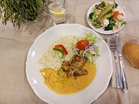 Vegetarisk: Falafel med jasminris och tomatsås, vitlökdressing