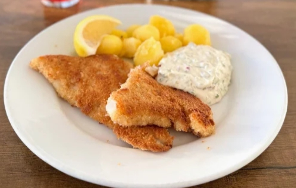 Panerad fläskschnitzel med stekt potatis och rödvinssås