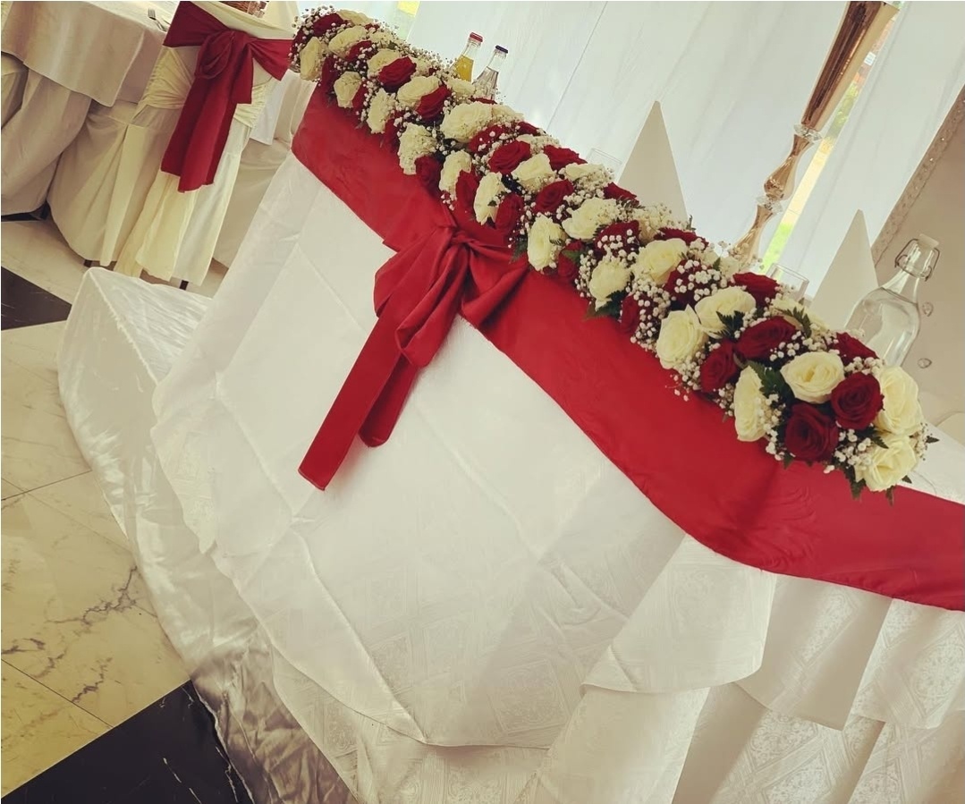 Stilfull bröllopsdukning i klassiskt vitt med djupröda sidenrosetter som skapar en elegant kontrast. Runda bord med krispiga dukar, noggrant vikta servetter och blomsterarrangemang i rött, crème och grönt ger rummet karaktär och värme. En genomtänkt dekoration som passar perfekt för ett bröllop med tidlös elegans och romantisk känsla