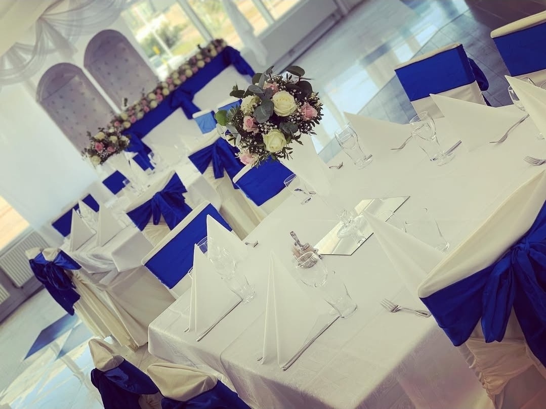 En klassisk och stilren dukning i vitt och djup kungligt blått skapar en elegant och tidlös känsla. Mjukt klädda stolar med rosetter, prydligt vikta servetter och harmoniska blomsterarrangemang ger rummet en exklusiv helhet. En dukning som utstrålar romantik, elegans och perfektion – skapad för att rama in er stora dag på allra vackraste sätt.
