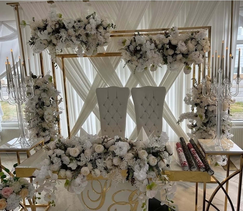 Ett hav av vitt, champagne och guld där mjuka tyger svävar från taket och sidenrosetter omfamnar varje stol. Eleganta dukningar, gnistrande detaljer och blomster i full blom skapar en drömlik och tidlös atmosfär – en exklusiv inramning för kärlekens största ögonblick.
