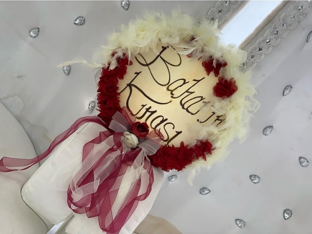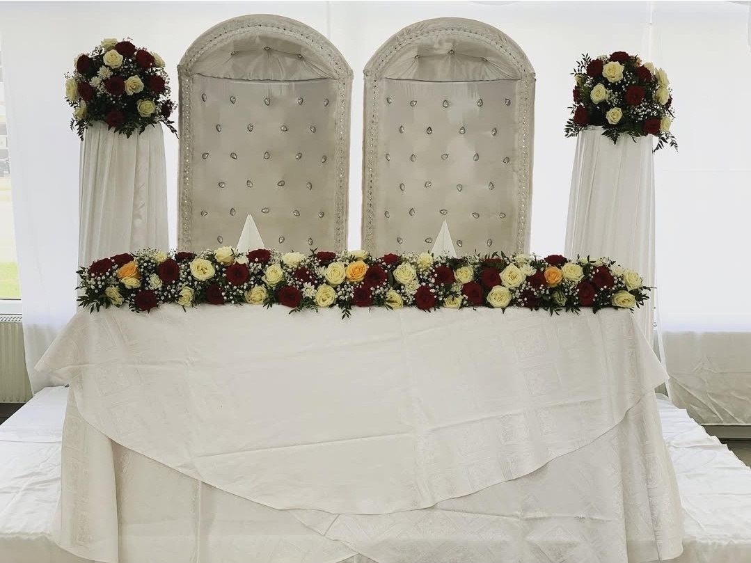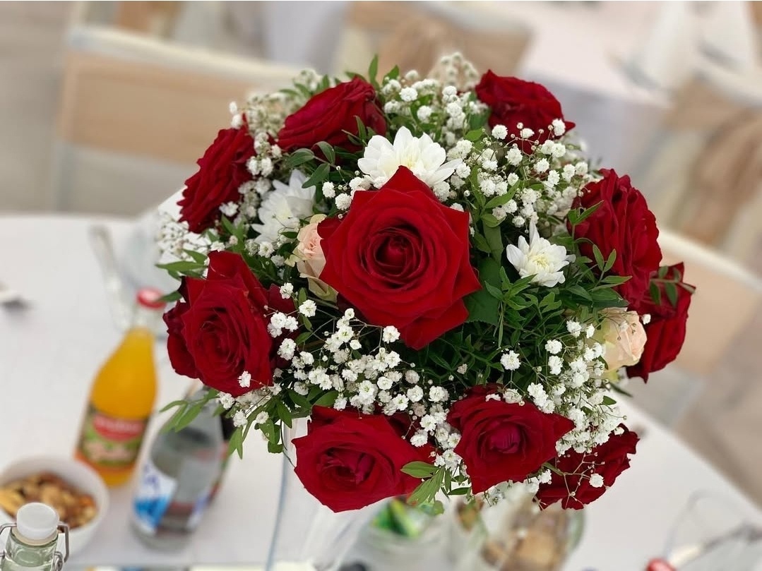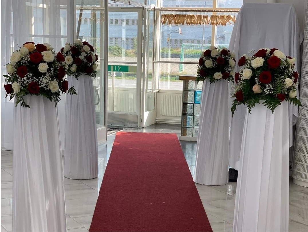 Elegant bröllopsdukning i vitt och champagne med runda bord och vinröda detaljer, stilrena servetter, matchande stolsöverdrag och blomsterarrangemang i vinrött och crème. En genomarbetad helhetslösning som skapar en exklusiv och inbjudande festmiljö för ert bröllop.