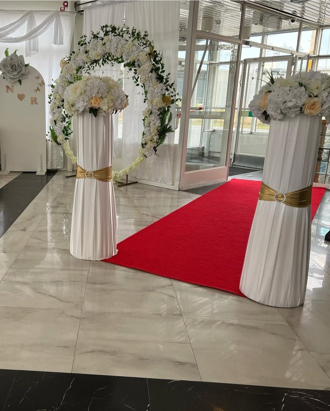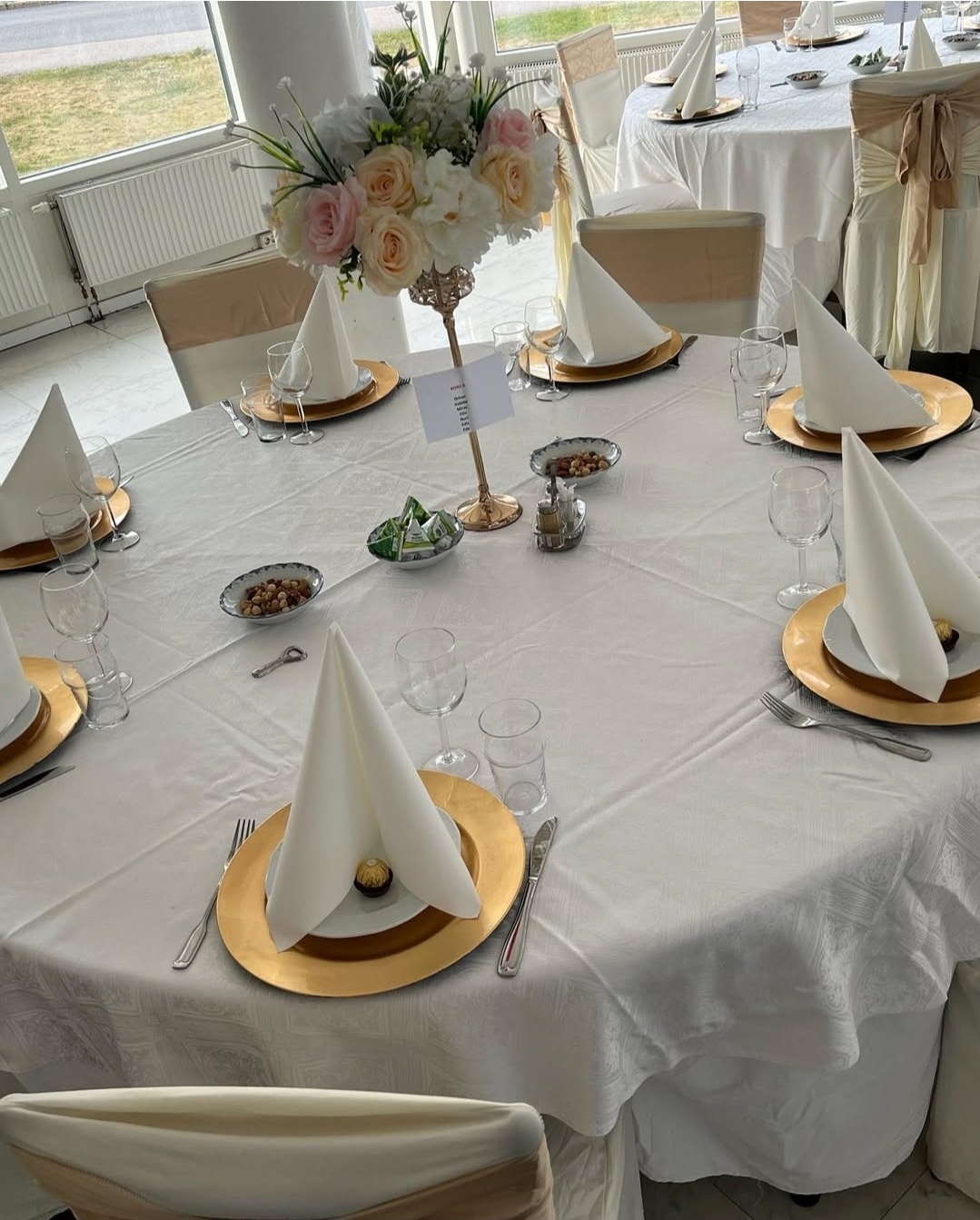 Elegant bröllopsdukning i toner av vitt, champagne och guld. Mjuka stolsrosetter i siden, krispiga linneservetter, gnistrande glas och höga blomsterarrangemang i vitt skapar en romantisk och tidlös känsla – perfekt för ett oförglömligt bröllop.