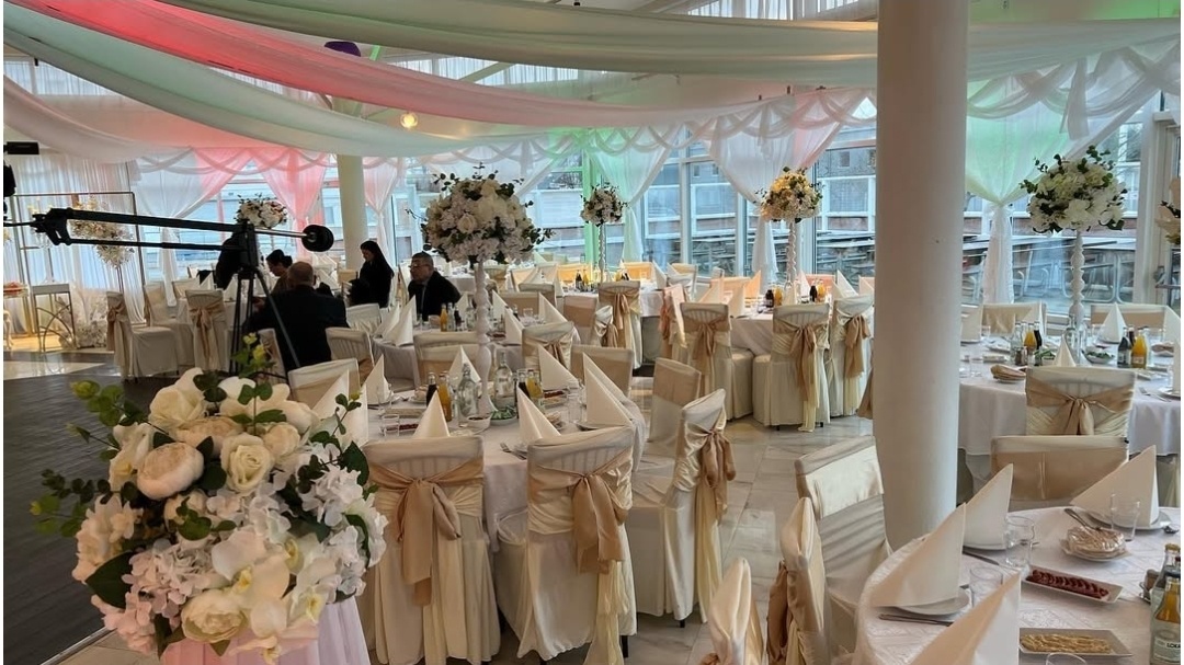 När gästerna kliver in möts de av mjuka tyger som ramar in rummet och ett varmt ljus som speglar sig i glas och porslin. Runda bord klädda i vitt, varsamt dekorerade med rosa rosetter, skapar en inbjudande och genomtänkt helhet. Blicken dras naturligt mot honnörsbordet, där blomster, ljus och detaljer samspelar för att lyfta brudparet och ge festen sin självklara mittpunkt.