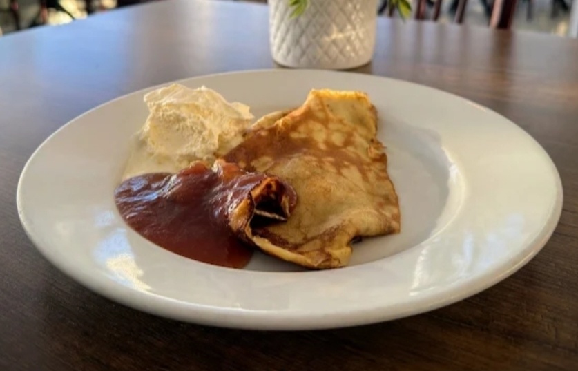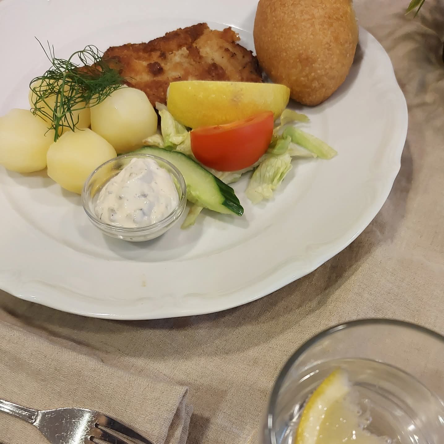 Panerad fläskschnitzel med stekt potatis och rödvinssås, anjovisröra
