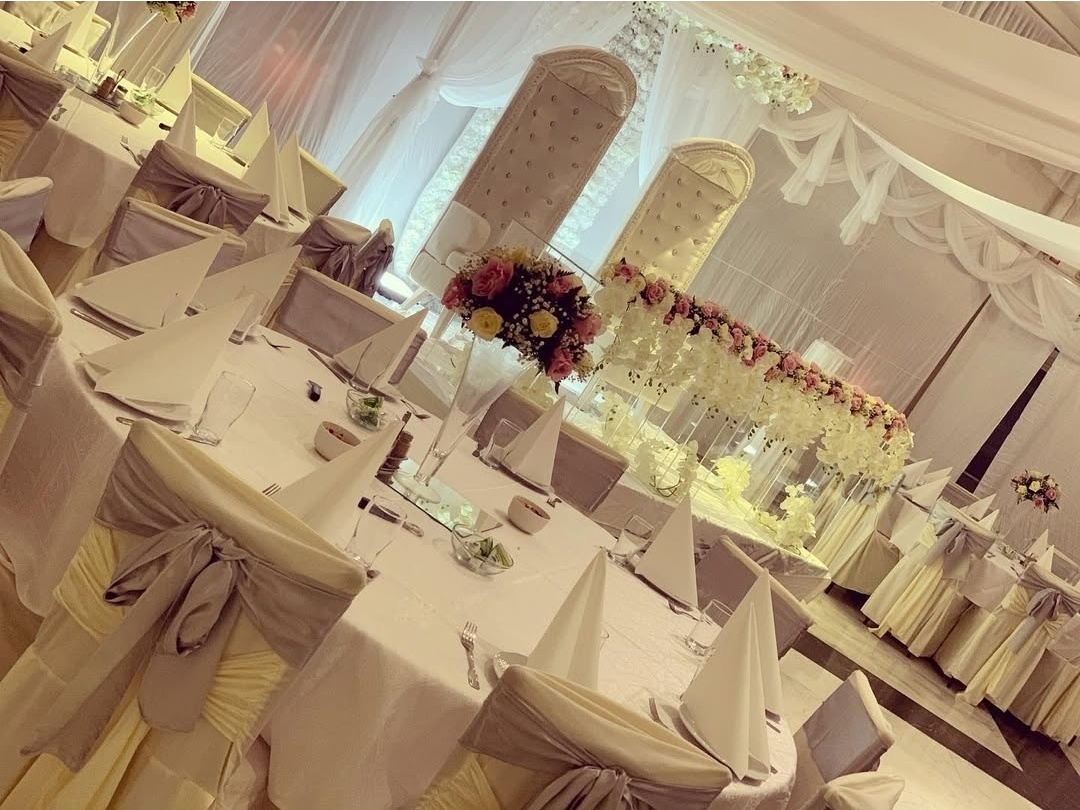 Elegant bröllopsdukning i sofistikerade silver- och vittoner. Runda bord med exklusiva dukar, stilrena stolsöverdrag med silverfärgade rosetter och noggrant utvalda detaljer skapar en lyxig och sammanhållen helhet. Mjuka ljussättningar och blomsterarrangemang i ljusa nyanser ger rummet en exklusiv känsla – perfekt för ett bröllop med modern elegans och tidlös stil.