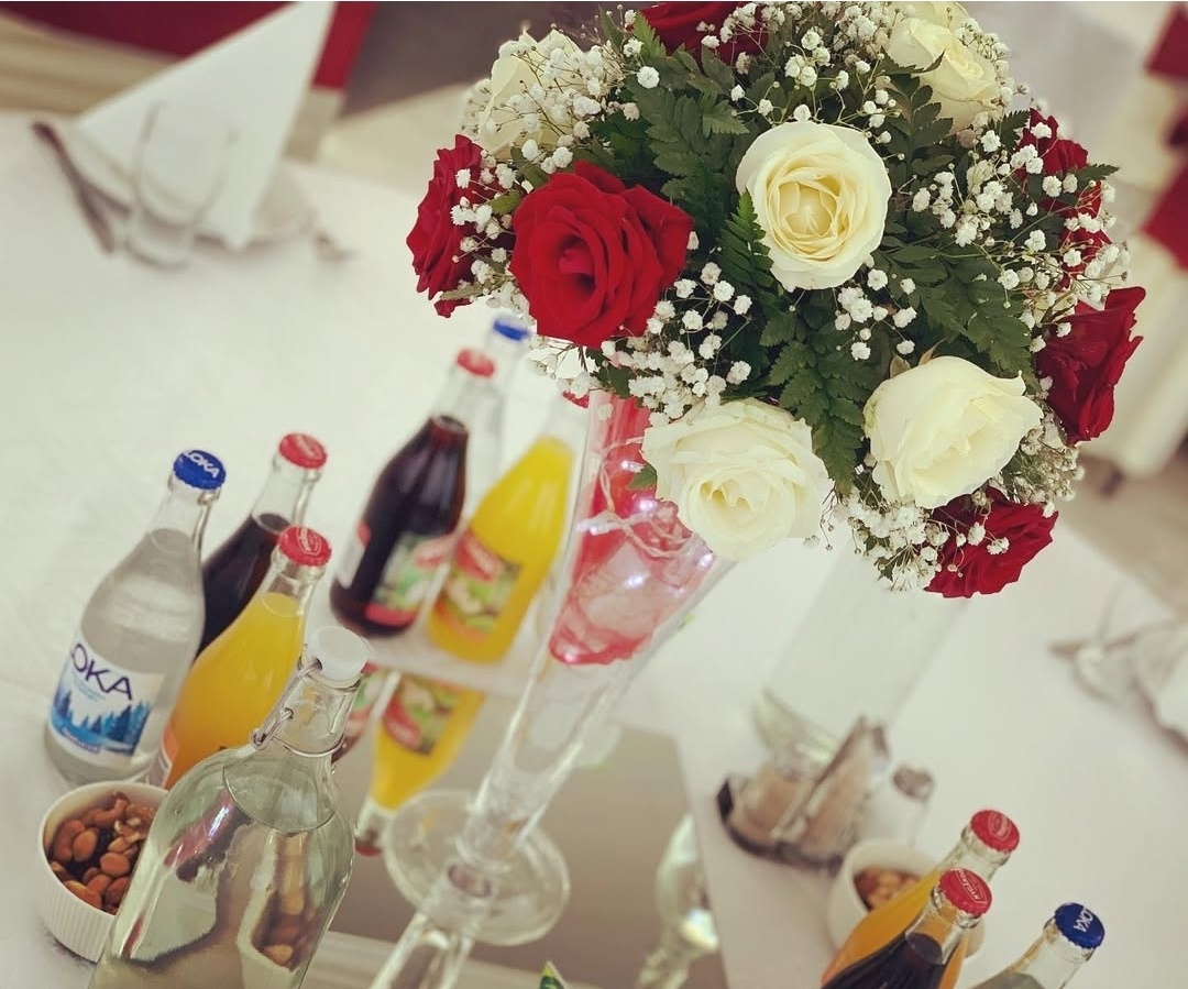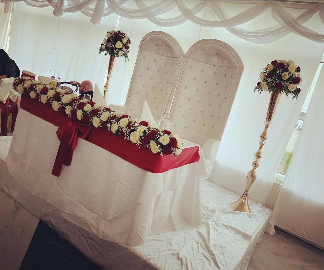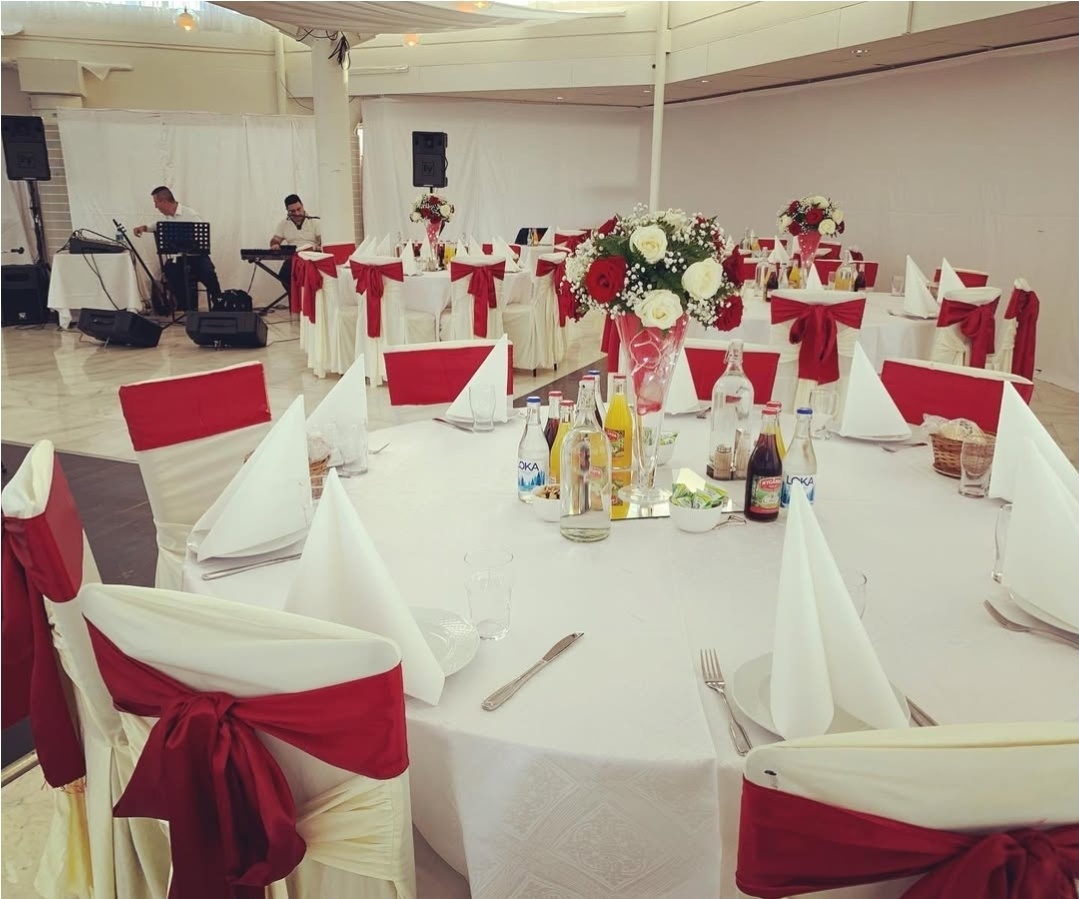 Stilfull bröllopsdukning i klassiskt vitt med djupröda sidenrosetter som skapar en elegant kontrast. Runda bord med krispiga dukar, noggrant vikta servetter och blomsterarrangemang i rött, crème och grönt ger rummet karaktär och värme. En genomtänkt dekoration som passar perfekt för ett bröllop med tidlös elegans och romantisk känsla