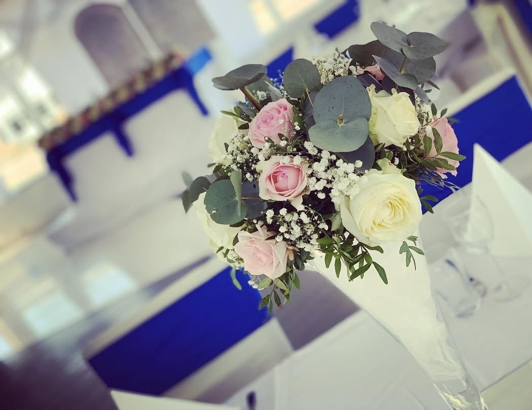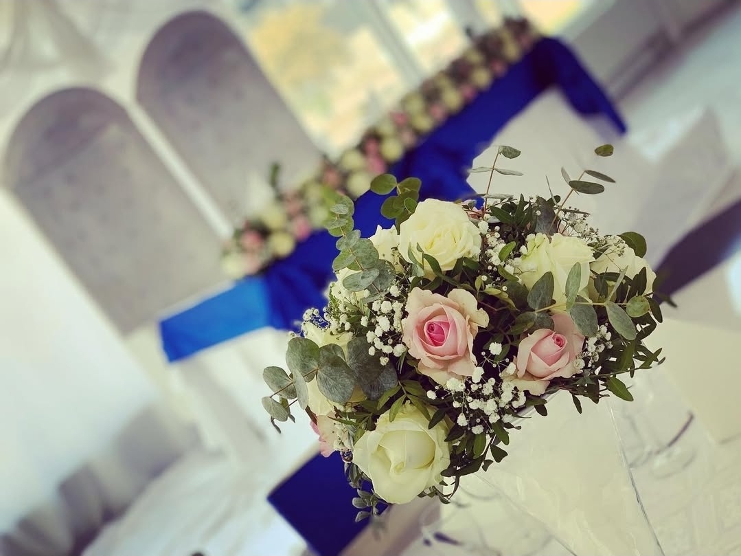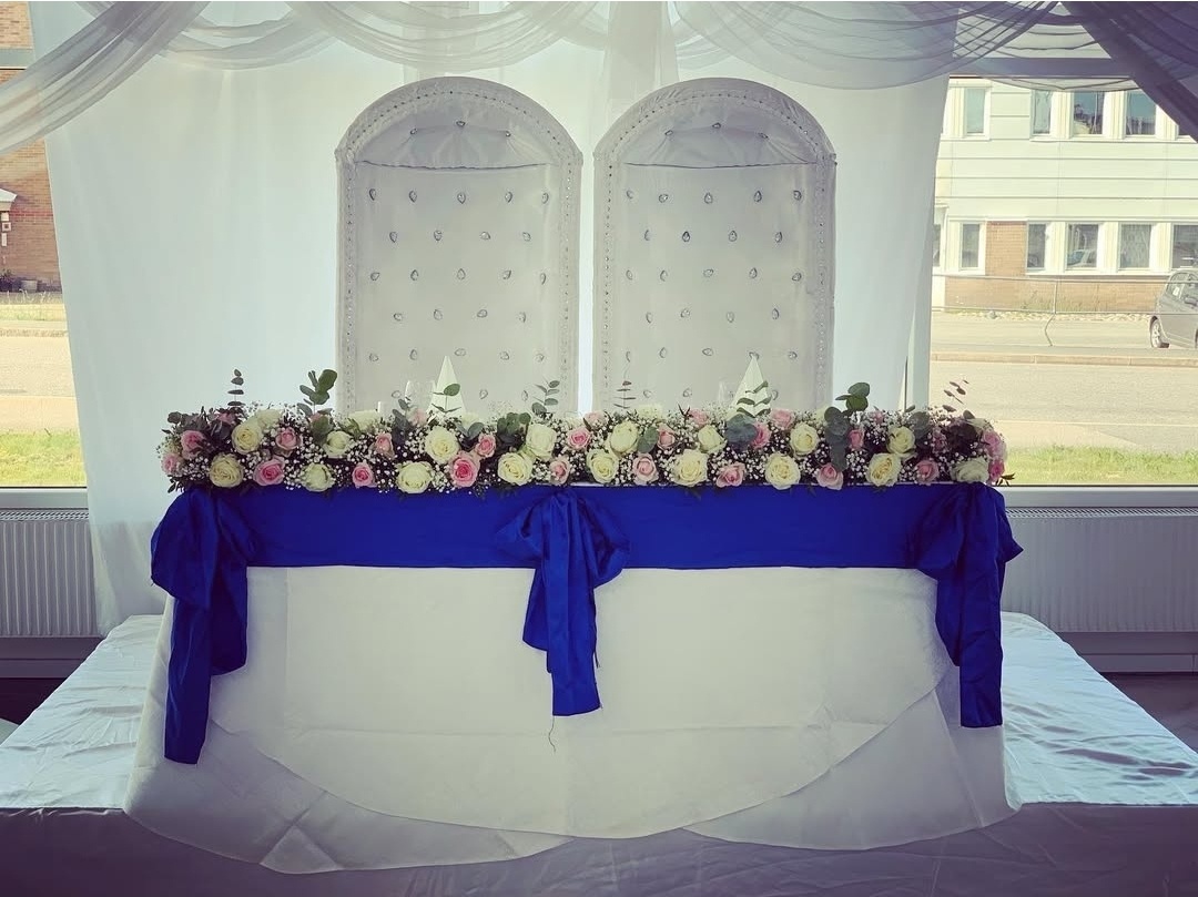 En klassisk och stilren dukning i vitt och djup kungligt blått skapar en elegant och tidlös känsla. Mjukt klädda stolar med rosetter, prydligt vikta servetter och harmoniska blomsterarrangemang ger rummet en exklusiv helhet. En dukning som utstrålar romantik, elegans och perfektion – skapad för att rama in er stora dag på allra vackraste sätt.