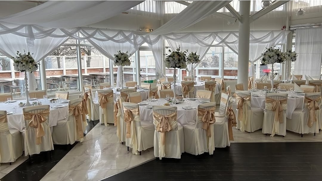 När gästerna kliver in möts de av mjuka tyger som ramar in rummet och ett varmt ljus som speglar sig i glas och porslin. Runda bord klädda i vitt, varsamt dekorerade med rosa rosetter, skapar en inbjudande och genomtänkt helhet. Blicken dras naturligt mot honnörsbordet, där blomster, ljus och detaljer samspelar för att lyfta brudparet och ge festen sin självklara mittpunkt.