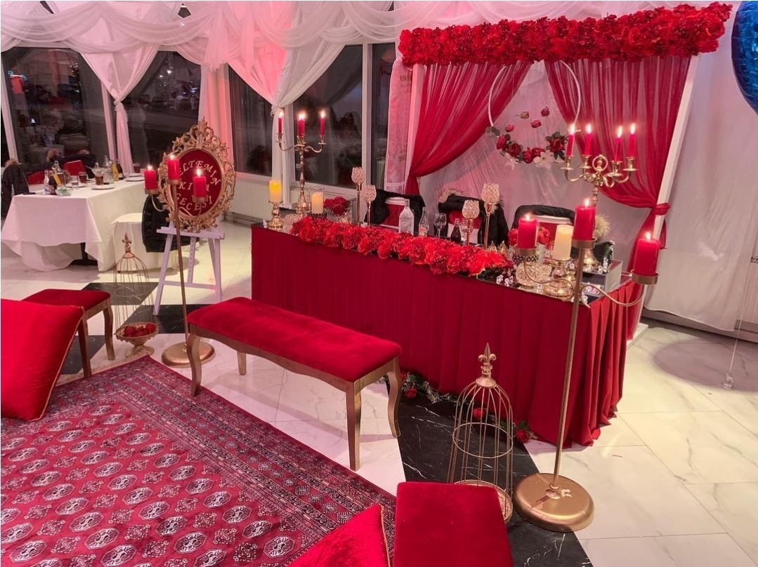 En klassisk och tidlös dukning i vitt och rött skapar en varm och festlig atmosfär. De djupröda stolsrosetterna, prydligt vikta servetter och blomsterarrangemang i matchande toner ger en harmonisk och exklusiv helhet – perfekt för ett högtidligt och minnesvärt henna firande.