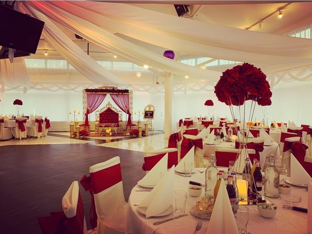 En pampig och elegant dukning i vitt och djupt vinrött skapar en exklusiv och stämningsfull atmosfär. De generösa stolsrosetterna, de höga blomsterarrangemangen och den vackert dekorerade scenen ger rummet en kunglig känsla där varje detalj andas lyx, tradition och fest.
