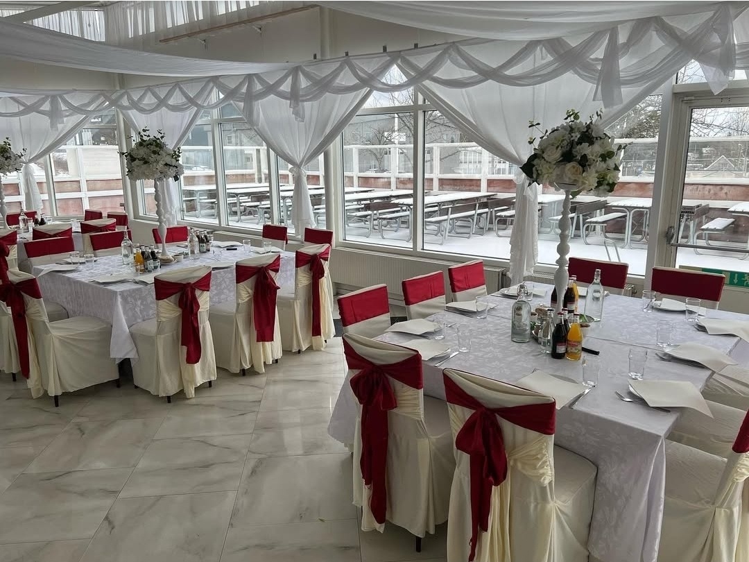 En stilfull och harmonisk dukning i vitt och vinrött skapar en exklusiv och inbjudande atmosfär. De vackert draperade stolarna med djupa rosetter, de höga blomsterarrangemangen och de mjuka tygdekorationerna i taket ger rummet en luftig och lyxig känsla – perfekt för ett högtidligt firande