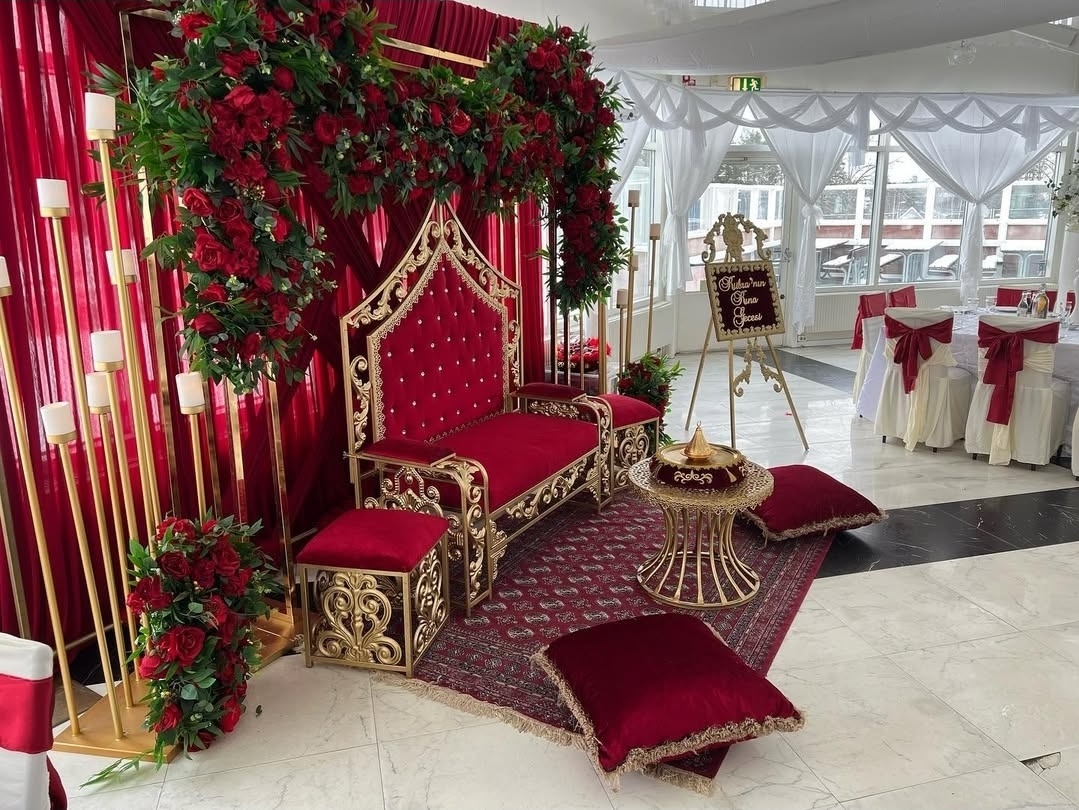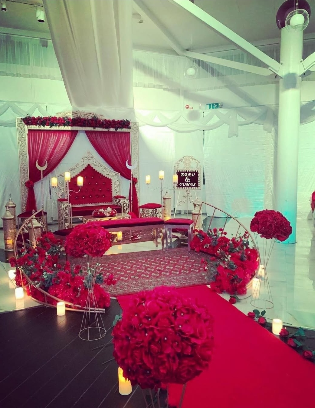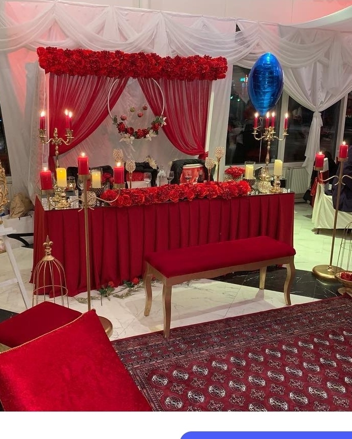 En storslagen hennadekoration i rött och guld, där traditionell prakt möter modern elegans. Blommor, ljus och exklusiva detaljer skapar en magisk och minnesvärd atmosfär.
