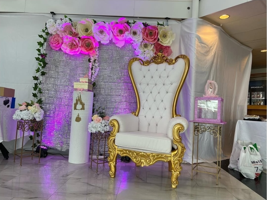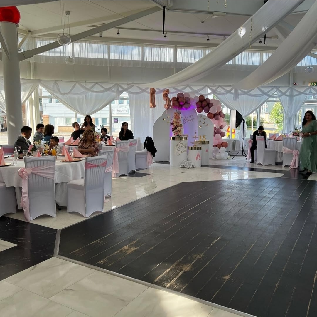 En storslagen och elegant dukning i vitt och rosa skapar en exklusiv helhet för födelsedagsfirande. De mjukt draperade tygerna i taket, den stilfulla ballongdekorationen och den genomtänkta dukningen ger lokalen en luftig, festlig och minnesvärd atmosfär.