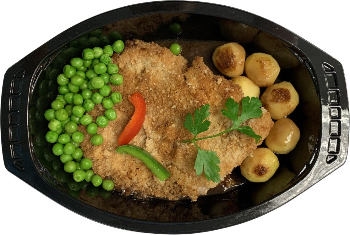 Schnitzel: (45%) griskött, VETEMJÖL, ÄGG, STRÖBRÖD, salt, peppar, rapsolja. Sås: (5 %), köttbuljong, vatten, kryddor. Potatis: (45%) kryddor, rapsolja, gröna ärtor.